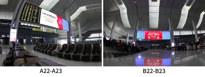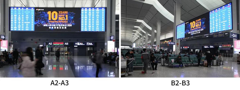 屏體主要安裝在車站候車大廳南、北兩側和東、西兩側,A2-A3、B2-B3、A22-A23、B22-B23四個進站口的立柱間上方,使用多達1200個KL2.5箱體,總面積達369㎡。