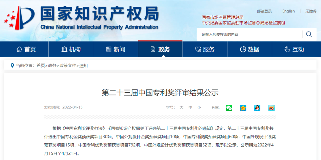 中國專利獎是我國唯一的專門對授予專利權(quán)的發(fā)明創(chuàng)造給予獎勵的政府部門獎,也是我國知識產(chǎn)權(quán)領(lǐng)域的最高級別榮譽,得到聯(lián)合國世界知識產(chǎn)權(quán)組織的認可,極具公信力、代表性與影響力。