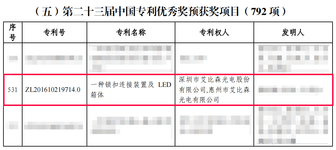 近日,國家知識產(chǎn)權(quán)局公布了第二十三屆中國專利獎評審結(jié)果,艾比森發(fā)明專利“一種鎖扣連接裝置及LED箱體”榮獲中國專利優(yōu)秀獎。