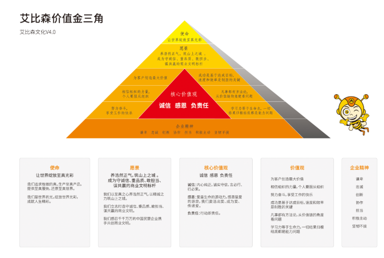 價值金三角作為意識形態(tài)理念,是我們企業(yè)的靈魂及核心所在。代表著艾比森的軟實力,讓艾比森具有區(qū)別于其他企業(yè)的不同之處。艾比森價值金三角存在于員工的潛意識,成為艾比森人為人處世的判斷標準,為艾比森人提供了工作準則和忠實的職業(yè)信仰。價值金三角的存在正是艾比森企業(yè)文化管理中所表現(xiàn)出來的最大特色。