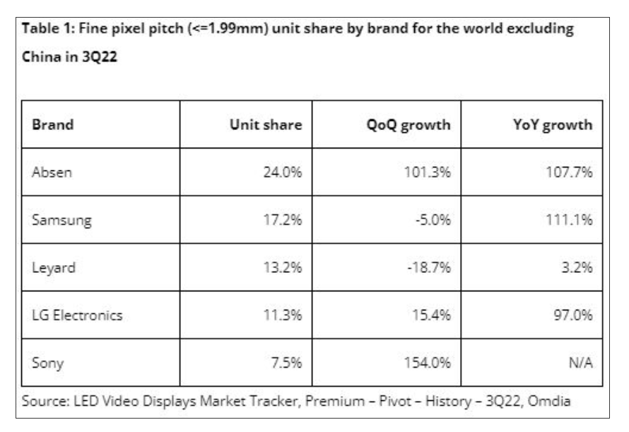 市場調研機構Omdia近期報道顯示,2022年三季度,P1.99mm以下間距LED市場增長迅速,艾比森海外市場份額占比繼續(xù)穩(wěn)居全球第一,再次彰顯了行業(yè)領軍企業(yè)的品牌實力。