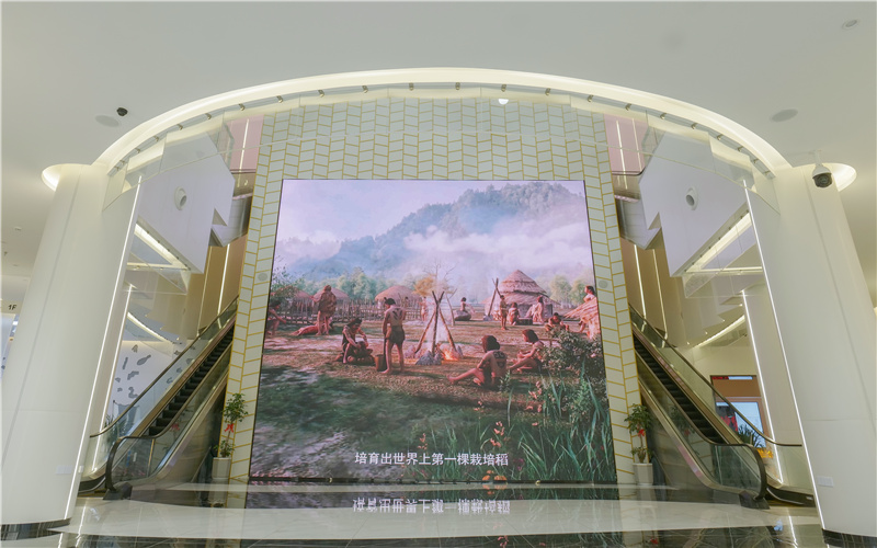 來(lái)到城市館的序廳,LED巨幕尤為引人注目,技術(shù)與文化藝術(shù)深度交融,直觀地勾勒出萬(wàn)年縣作為世界稻作文化發(fā)源地、中國(guó)貢米之鄉(xiāng)、中國(guó)優(yōu)質(zhì)淡水珍珠之鄉(xiāng)的發(fā)展歷程。