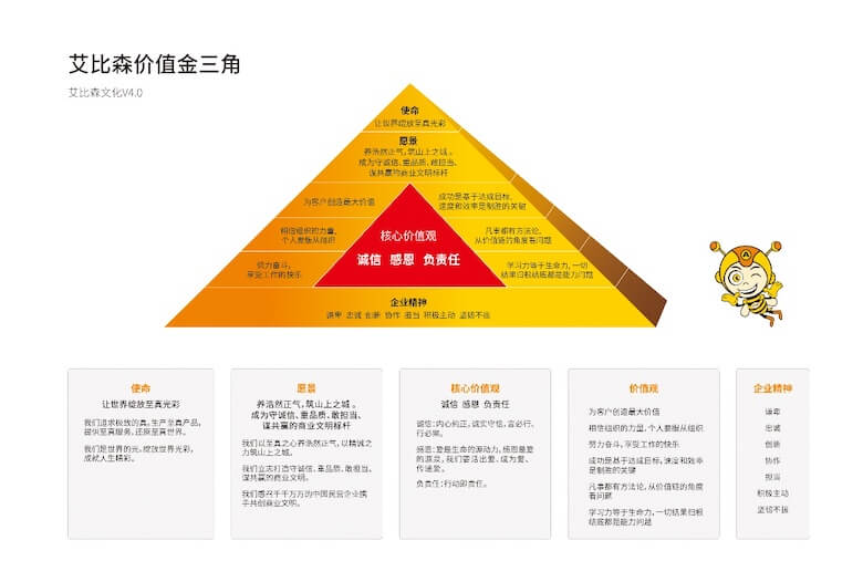艾比森企業(yè)文化以“價值金三角”為行事標(biāo)準(zhǔn)與指南。艾比森選人、用人、做人均以“價值金三角”為基石。