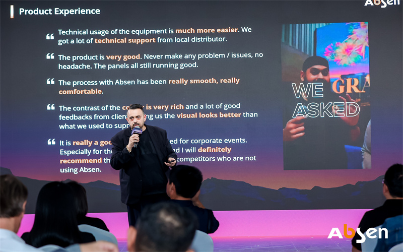本次發(fā)布會,來自北美、歐洲和東南亞的合作伙伴現(xiàn)場分享了與艾比森同行的點點滴滴。出于對艾比森品牌實力與產(chǎn)品品質(zhì)的認可、對企業(yè)文化的認同,他們開啟了與艾比森的合作之旅。通過詳實的數(shù)據(jù)、豐富的產(chǎn)品案例、真實的客戶評價,展示了LED顯示行業(yè)合作共贏的發(fā)展路徑。