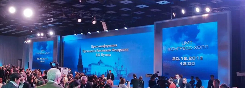 早在2012年的時候,普京重新上任的首次大型記者發(fā)布會上,艾比森與普京總統(tǒng)首次結(jié)緣。俄方租賃了艾比森兩塊P3.9mm顯示屏(左邊和中間的屏幕),而右邊的大屏則由其他廠家提供。在清楚的對比之下,可以看出右邊的屏幕水波紋十分明顯。