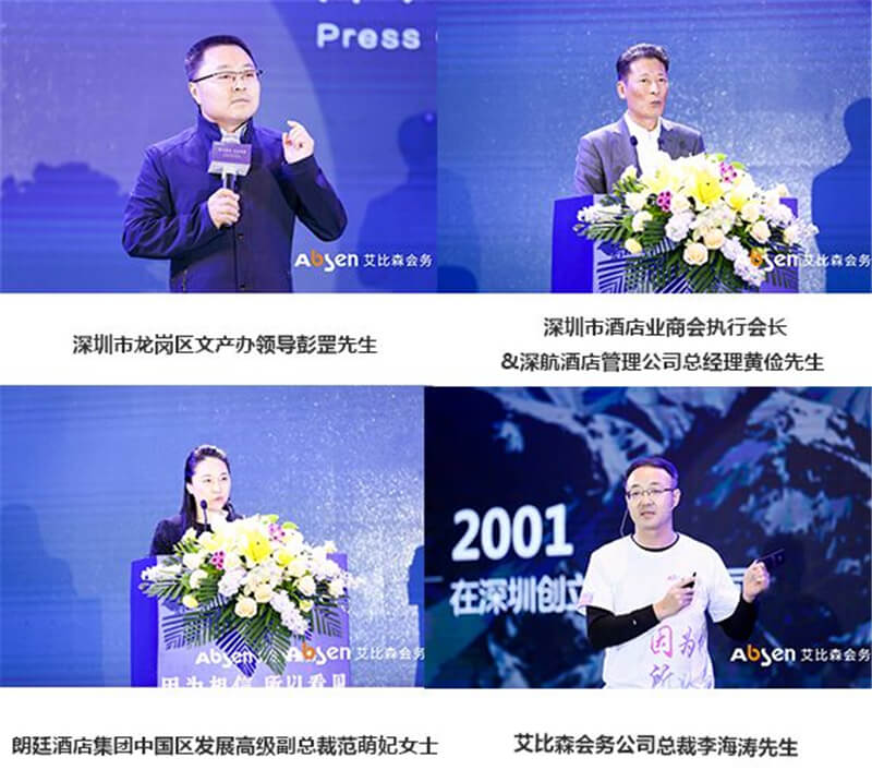 隨后龍崗區(qū)文產(chǎn)辦領(lǐng)導(dǎo)彭罡先生、深圳市酒店業(yè)商會(huì)執(zhí)行會(huì)長(zhǎng)&深航酒店管理公司總經(jīng)理黃儉先生、朗廷酒店集團(tuán)中國(guó)區(qū)發(fā)展高級(jí)副總裁范萌妃女士分別在發(fā)布會(huì)上致辭,紛紛對(duì)艾比森會(huì)務(wù)公司的成立表示祝賀以及對(duì)未來(lái)發(fā)展的看好和期待。