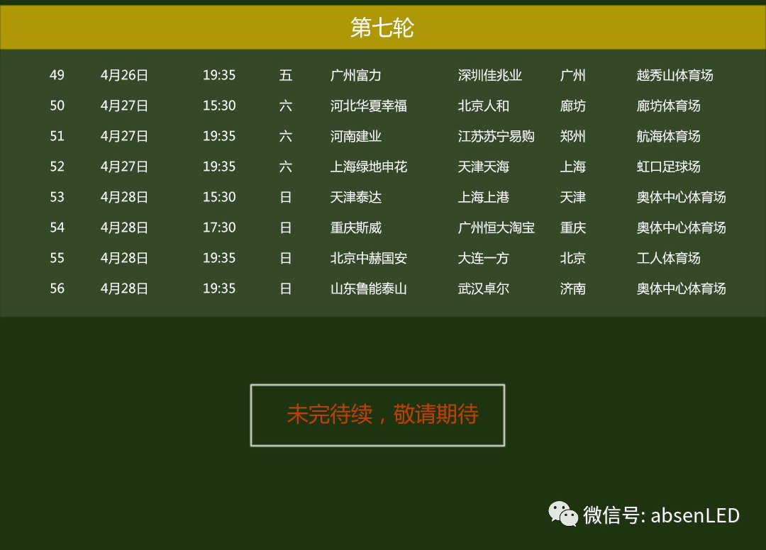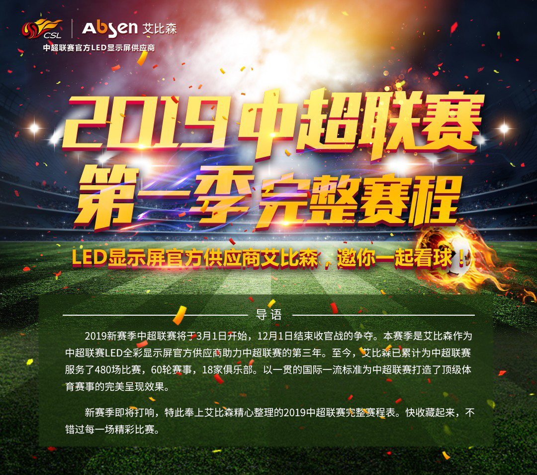 3月1日,2019中超戰(zhàn)火重燃,上港失去最佳射手武磊能否衛(wèi)冕冠軍,注入新鮮血液的恒大能否重奪冠軍,深足重返中超會有怎樣的表現(xiàn)等令人無比關(guān)注。作為中超聯(lián)賽2017-2021年官方LED顯示屏供應(yīng)商,艾比森奉上第一季(3月1日-4月28日)詳盡賽程表,趕緊收藏起來,精彩賽事不容錯過!