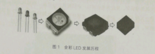 全彩LED封裝形式經(jīng)歷了直插式LED( Lamp LED SMD LED),COB封裝也在近幾年進(jìn)入市場,如圖1所示。