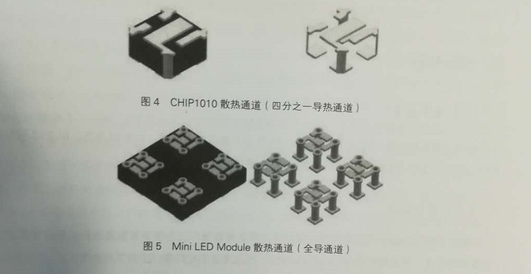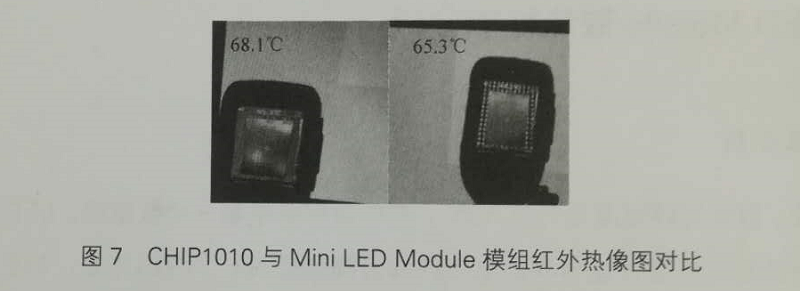 Mini LED Module產(chǎn)品增加了散熱通道,明顯減少了結(jié)構(gòu)熱阻,因此可以比傳統(tǒng)CHIP1010產(chǎn)品維持更低的LED芯片結(jié)溫,如圖4、圖5所示。