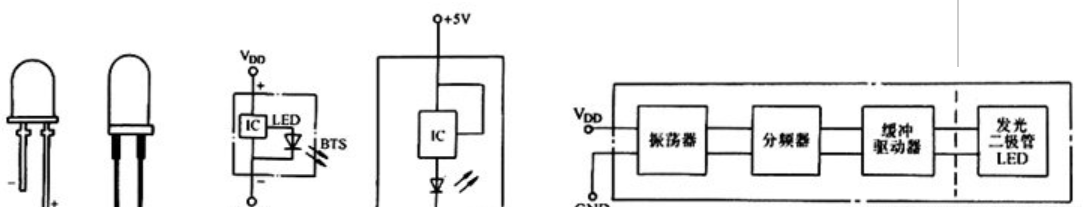 4.閃爍發(fā)光二極管? 閃爍發(fā)光二極管(BTS)是一種由CMOS集成電路和發(fā)光二極管組成的特殊發(fā)光器件,可用于報警指示及欠壓、超壓指示。其外形、內(nèi)部結(jié)構(gòu)圖及內(nèi)電路框圖見下圖。