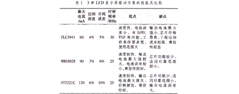 上述3種LED顯示屏驅(qū)動方案的比較如表1所示。