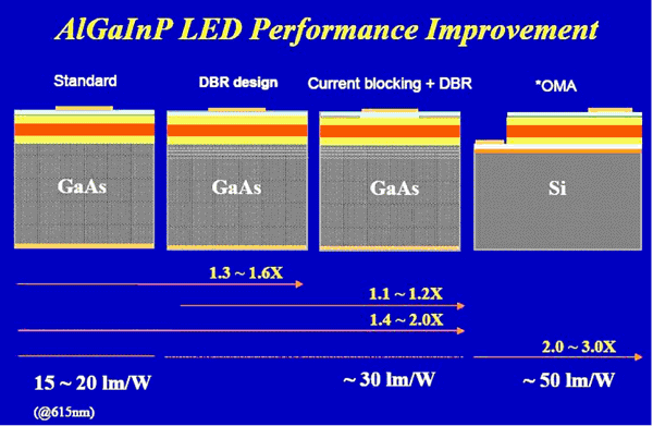 ▲各種AlGaInP LED的發(fā)光效能強化法,由左至右為技術(shù)先進度的差別,最左為最基礎(chǔ)標(biāo)準(zhǔn)的LED幾何結(jié)構(gòu),接著開始加入DBR(Distributed Bragg Reflector)反射層,再來是有DBR后再加入電流局限(Current Blocking)技術(shù),而最右為晶元光電的OMA(Omni-directional Mirror Adherence)全方位鏡面接合技術(shù),該技術(shù)也將基板材質(zhì)從GaAs換成Si。