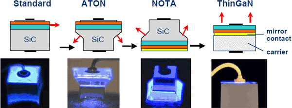 ▲對GaN、InGaN化合材料的LED而言,也有其自有的一套制程結(jié)構(gòu)光通強化法,以德國OSRAM來說,1999年還在使用標(biāo)準(zhǔn)結(jié)構(gòu),2002年就進展到ATON結(jié)構(gòu),2003年換成更佳的NOTA結(jié)構(gòu),2005年則是ThinGaN結(jié)構(gòu)。