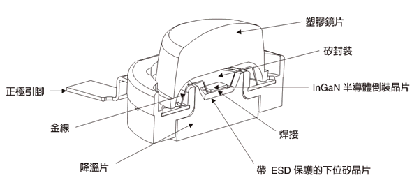 ▲Lumileds Lighting公司的Luxeon系列LED(InGaN)的橫切面圖,從圖中可知Luxeon用矽封裝進行裸晶防護,而非傳統(tǒng)的環(huán)氧樹脂。