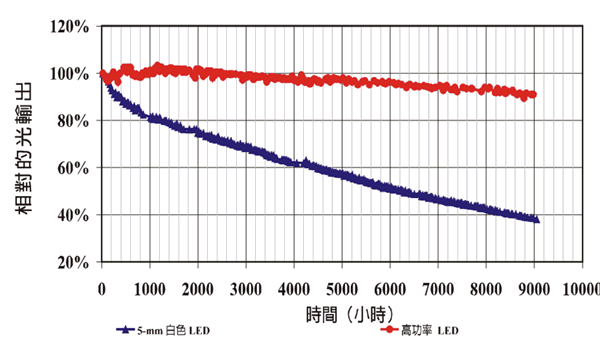 ▲隨著使用時間的增長,LED的光通量也會逐漸降低,圖中是兩個LED的壽命光通量曲線比較,下方藍色線為一般5mm的WLED指示燈,上方紅色線則是高功率LED照明燈。